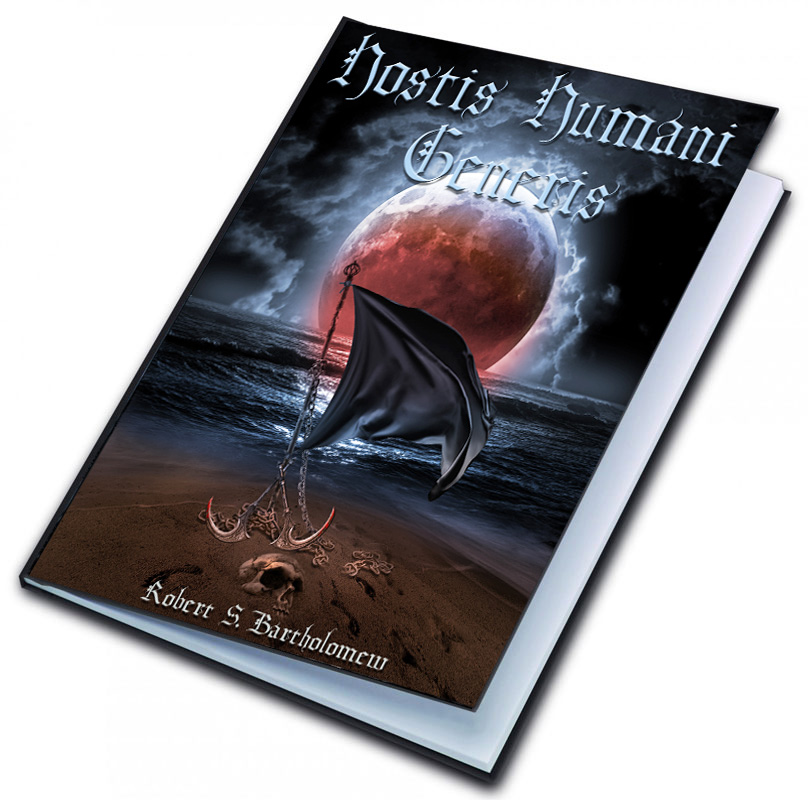 Hostis Humani Genaris, Robert S. Bartholomew, US2017 Book cover concept design. This is a simple example of when an author wants to bring several different concepts together. The novel content required a modern Chicago skyline combined with the futuristic, sinister moon rise and a pirate-ship steering wheel. |