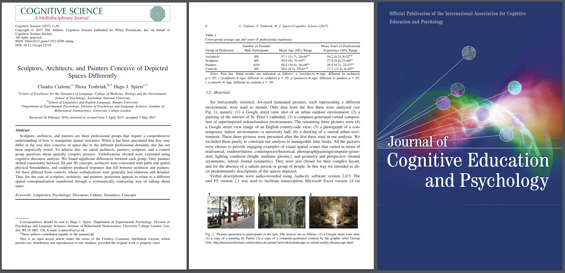 Cognitive Science Journal, University College London, UK2017 June. Reasearch title: Sculptors, Architects, and Painters Conceive of Depicted Spaces Differently. Authors: Claudia Cialone, Thora Tenbrink, Hugo J. Spiers. Department of Experimental Psychology, Division of Psychology and Language Sciences, Institute of Behavioural Neuroscience. Australian National University. Bangor University. Cognitive Science Society, ResearchGate illustration - Dreamscape ISSN: 0364-0213 |